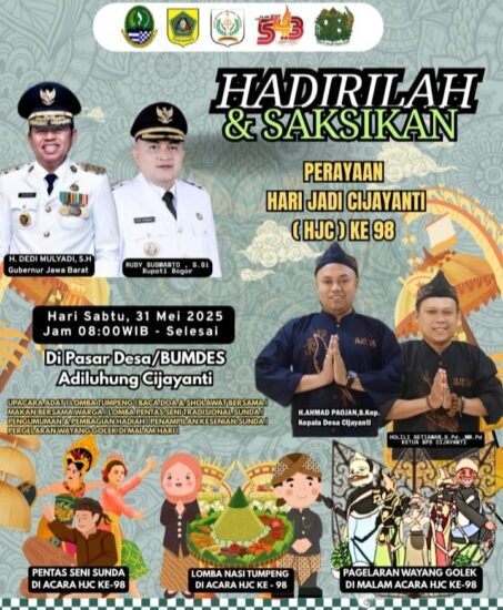 “Nanti malam puncak acaranya berupa Pagelaran Wayang Golek menampilkan Ki Dalang Deden K. Sunarya dari Giri Harja 2 Bandung, dan ini sebagai bentuk kecintaan warga Cijayanti terhadap seni budaya yang harus kita lestarikan bersama, dan dapat kami informasikan Wayang Golek ini bentuk sumbangan dari Pemkab Bogor untuk hiburan bagi masyarakat Cijayanti,” imbuh Tibet.